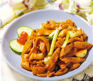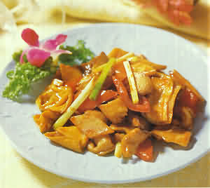3、煸炒后加鸡汤,用小火烧至酥烂时,再加入盐、味精、白糖、老抽王烧至熟烂汁浓,再用湿生粉勾芡,淋入麻油即成。