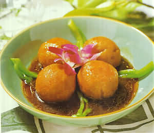 3、锅内留油,下入姜片、加入鸡汤、放入大肉丸子,放盐、味精、白糖、老抽王,用小火烧至汁浓,再用湿生粉勾芡收汁装碟即成。