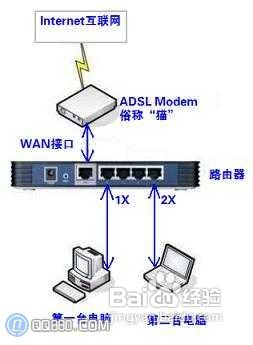 第一步:将ADSL Modem、路由器、电脑通过网络连接线正常连接,大致链接方法为,Modem(猫)与路由器的WAN接口链接,再将路由器上的其余接口(通常以1X、2X、3X等字符表示)的与电脑进行连接(因各品牌路由器、modem接口标识有所不同,这里不能一一表述清楚,具体的链接方法可以参照modem、路由器使用说明书),见下图所示: