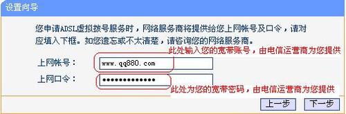 第二步:硬件设备连接好之后,开启就需要对软件进行设置了,首先对路由器进行设置,使路由器每次开机都能够实现自动拨号连接;我们以TP-Link路由器为例,打开IE浏览器,在地址栏中输入路由器网关192.168.1.1(部分路由器网关为192.168.0.1),按下回车键,此时会要求输入用户名和密码,大部分路由器出厂时默认的用户名密码都是admin,即用户名admin,密码也是admin(如果不对,请参考路由器使用说明书),进入路由器后台设置页面后,点击左边窗口的“设置向导”(如果品牌不同,找不到设置向导,就找关于设置的选项),弹出的“设置向导”中要求选择“上网方式”,选择“ADSL虚拟拨号(PPPoE)”,点击下一步,接下来输入ADSL宽带帐号和密码,这是电信服务上提供的宽带上网帐号和密码,输入完毕之后点击下一步,此时系统会弹出设置成功的提示点击“完成”即可,更为详尽的设置图解,请点击这里“路由器设置”。