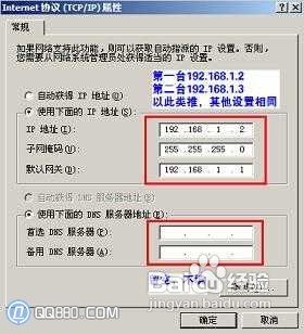 第三步:其次是电脑局域网设置,进行正确的局域网设置能够让多台电脑与路由器之间正常通讯,实现共享上网的目的;分别在两台电脑上进行如下设置,鼠标右键点击“网上邻居”——选择“属性”,鼠标右键点击“本地连接”(注意是本地连接而非宽带连接)——选择“属性”,弹出“本地连接属性”中双击“此连接使用下列项目”下方的“Internet 协议(TCP/IP)”,勾选“使用下面的IP地址”,将第一台电脑的“IP地址”设置为192.168.1.2,第二台设置为192.168.1.3,以此类推,子网掩码设置都统一为255.255.255.0,默认网关设置也都统一为192.168.1.1,最下方的“首选DNS服务器”和“备用DNS服务器”直接留空不填,最后点击“确定”退出。