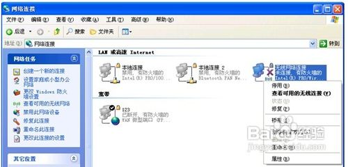 5、前面的步骤做好后,在是无线网络的连接,进入“控制面板”——“网络连接”界面,查看“无线网络连接”是否为“启用”状态,如为“禁用”状态,请右键点击“无线网络连接”,选择“启用”菜单即可。