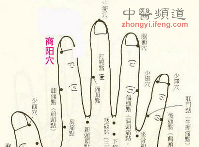 商阳穴位于食指尖端桡侧指甲旁。传统医学认为,刺激商阳穴具有明显的强精壮阳之养生功效,还可延缓性衰老。男人们在闲暇时,不妨用两手食指相钩反复牵拉。