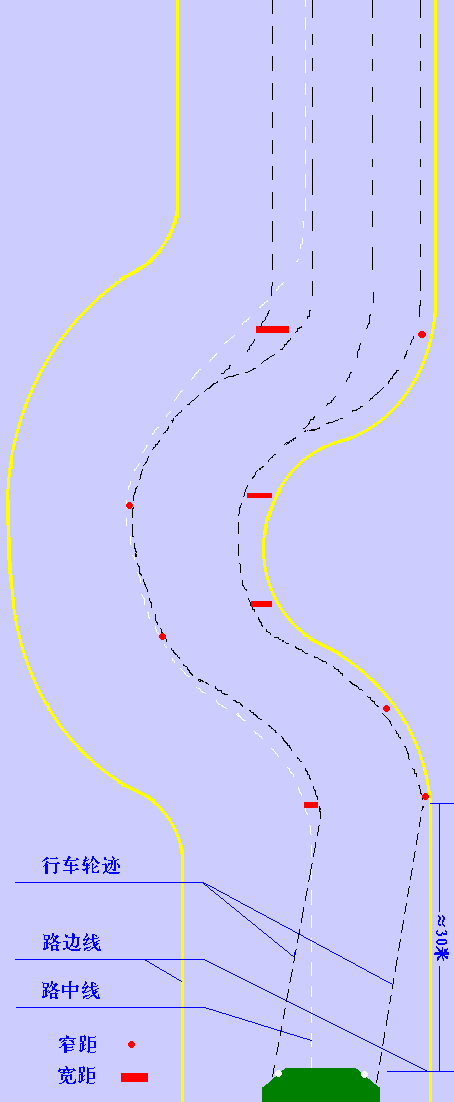 1、车辆行至距弯道约30米减速(或控制车速),并将车偏向右行驶,以到达弯道时紧道路右侧(窄)为准则,在到达弯道时(打方向前)达到最理想的转弯速度。