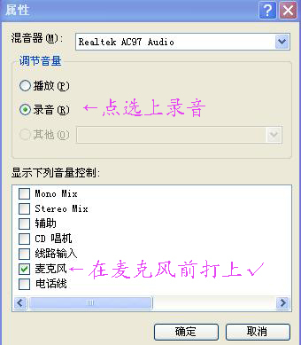 在对话框中执行:“选项”→“属性”在属性的对话框里,选择“录音”选项,在下方的列表中√选“麦克风”,点确定。